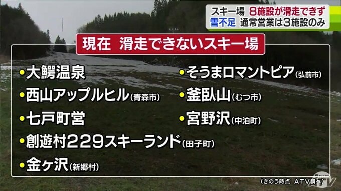 今シーズン、雪不足に見舞われている青森県内のスキー場。現在、8つの施設が滑走できなくなっていて、滑走できる施設も一部制限がある状況です。