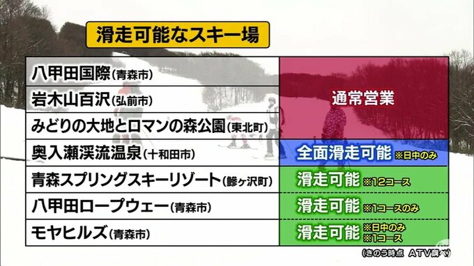 まず、青森県内で4日現在、滑走が可能なスキー場です。通常営業しているのは青森市の八甲田国際と弘前市の岩木山百沢、東北町のみどりの大地とロマンの森公園の3か所だけです。滑走可能なコースや時間帯を一部制限しながら営業しているのは鰺ヶ沢町の青森スプリングスキーリゾートや青森市のモヤヒルズなど4か所です。