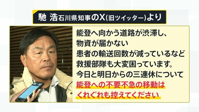 石川県・馳浩知事は「能登へ向かう道路が渋滞し物資が届かない、患者の輸送回数が減っているなど救援部隊も大変困っています。今日と明日からの三連休について、能登への不要不急の移動はくれぐれも控えてください」とSNSに投稿しています。災害のフェーズに合わせた支援が必要になります。