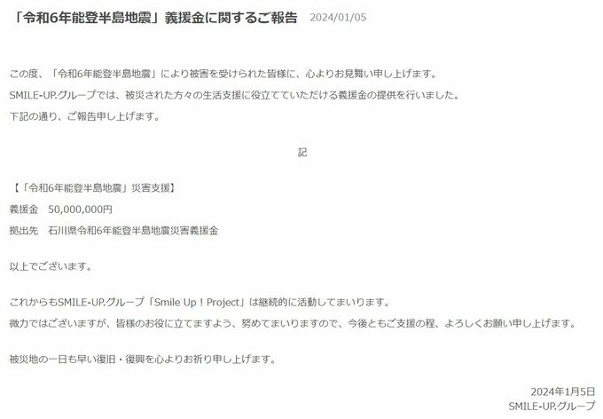 5日、SMILE-UP.社は公式サイトで、能登半島地震の被災地に5,000万円の義援金を提供したことを明らかにしました。