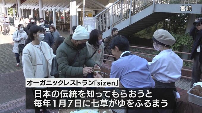 1月7日は、今年一年の無病息災を願う七草の日です。宮崎県宮崎市のレストランでは、七草がゆがふるまわれました。宮崎市の平和台公園内にあるオーガニックレストラン「sizen」では、日本の伝統を知ってもらおうと…