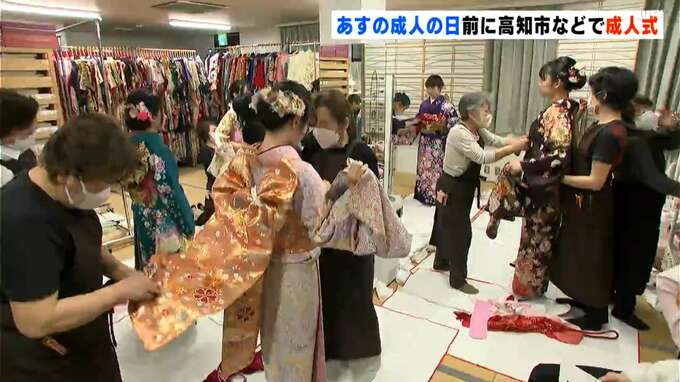 8日の成人の日を前に高知市や土佐市などで成人式が行われ、高知市の呉服店では朝から新成人の着付けが行われました。高知市にある呉服店「きもの処公文」では午前5時ごろからおよそ50人のスタッフが新成人の着付け…
