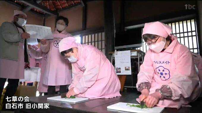 白石市の武家屋敷「旧小関家」で開かれた「七草の会」。地元の主婦らが「唱え歌」を口ずさみながらセリやナズナなどを刻み、春の七草をおかゆに入れ、150食分の「七草がゆ」をつくりました。