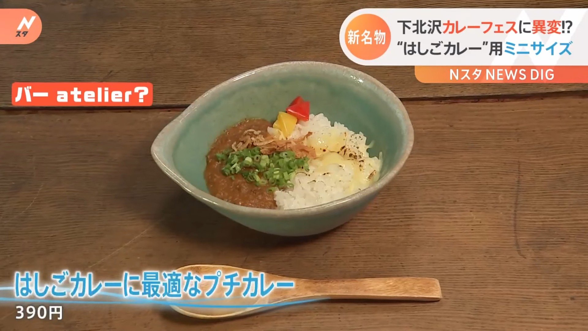 「バー atelier?」。カレーを盛り付けるのは可愛らしいお茶碗サイズの器です!その名も、「はしごカレーに最適なプチカレー」(390円)。ミニサイズとはいえ、1日でいったいどれだけ食べるんでしょうか?