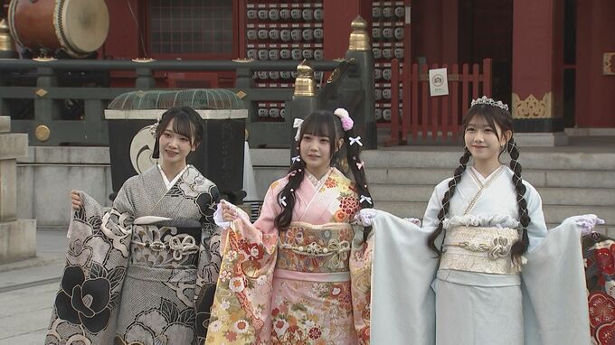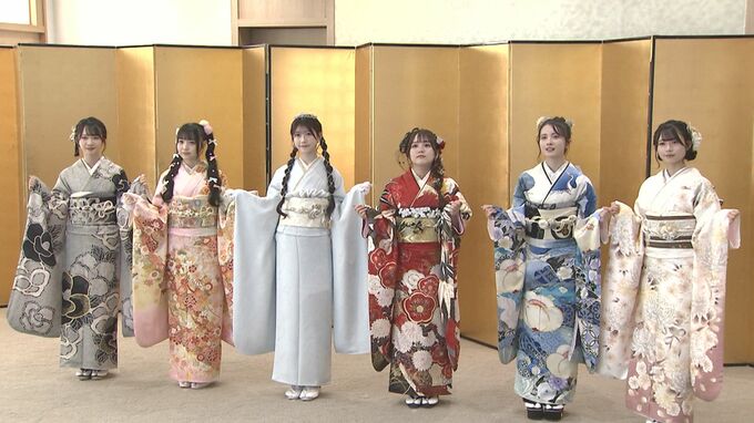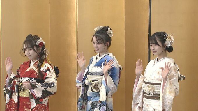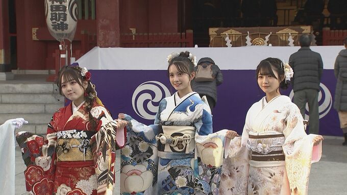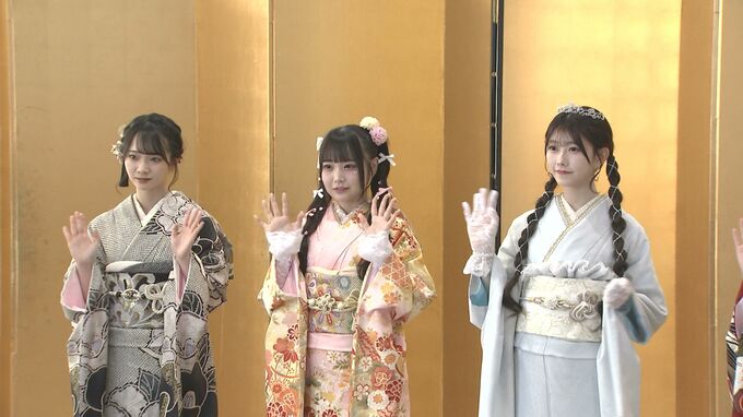 人気アイドルグループAKB48が東京・神田明神で『2024年 AKB48 二十歳のつどい』を行い、千葉恵里さん、佐藤美波さん、田口愛佳さん、太田有紀さん、水島美結さん、成田香姫奈さんら6人が艶やかな振袖姿を披露しました。