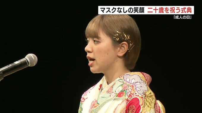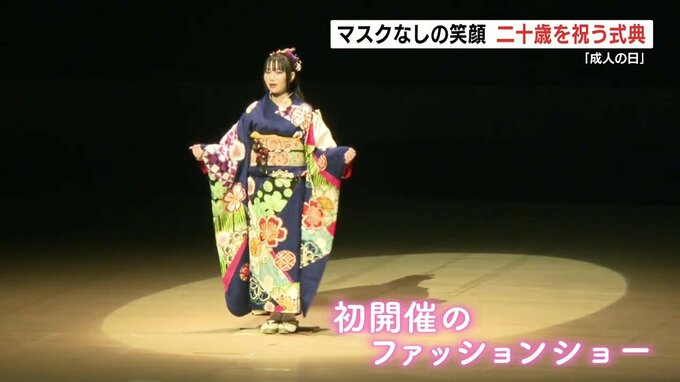 「はたちの記念式典」の始まりを飾ったのは、今年が初めての開催となるファッションショーです。事前に応募した参加者がステージ上で晴れ着姿を披露しました。