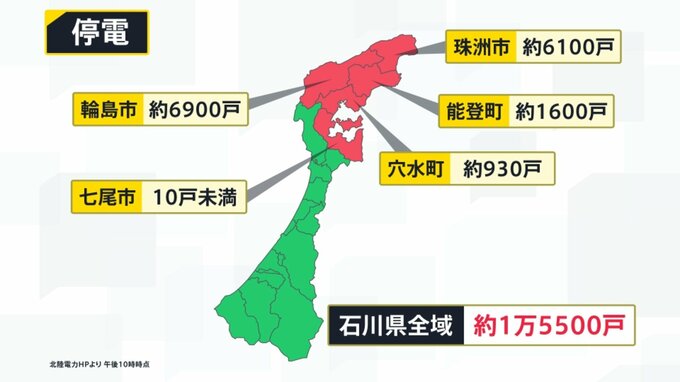 輪島市、七尾市、珠洲市、能登町、穴水町の約1万5500戸で停電が続いています。こちらもまだ復旧のめどは立っていないという状況です。