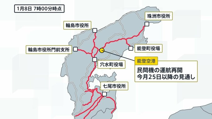 8日午前7時時点の道路の状況です。能登地方の国道や県道などの主な道路ですが、輪島市役所門前支所、七尾市役所、穴水町役場、能登空港、輪島市役所、能登町役場、珠洲市役所などに繋がる道が通行ができるようになりました。