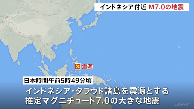 日本時間の午前6時前、インドネシア付近で大きな地震が発生しました。気象庁は、日本への津波の影響はないとしています。気象庁によりますと、日本時間の午前5時49分ごろ、インドネシアのタラウド諸島を震源とする…