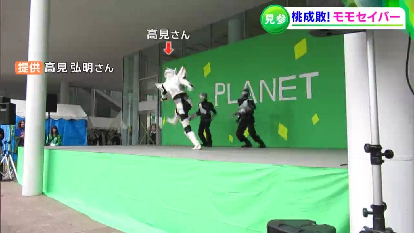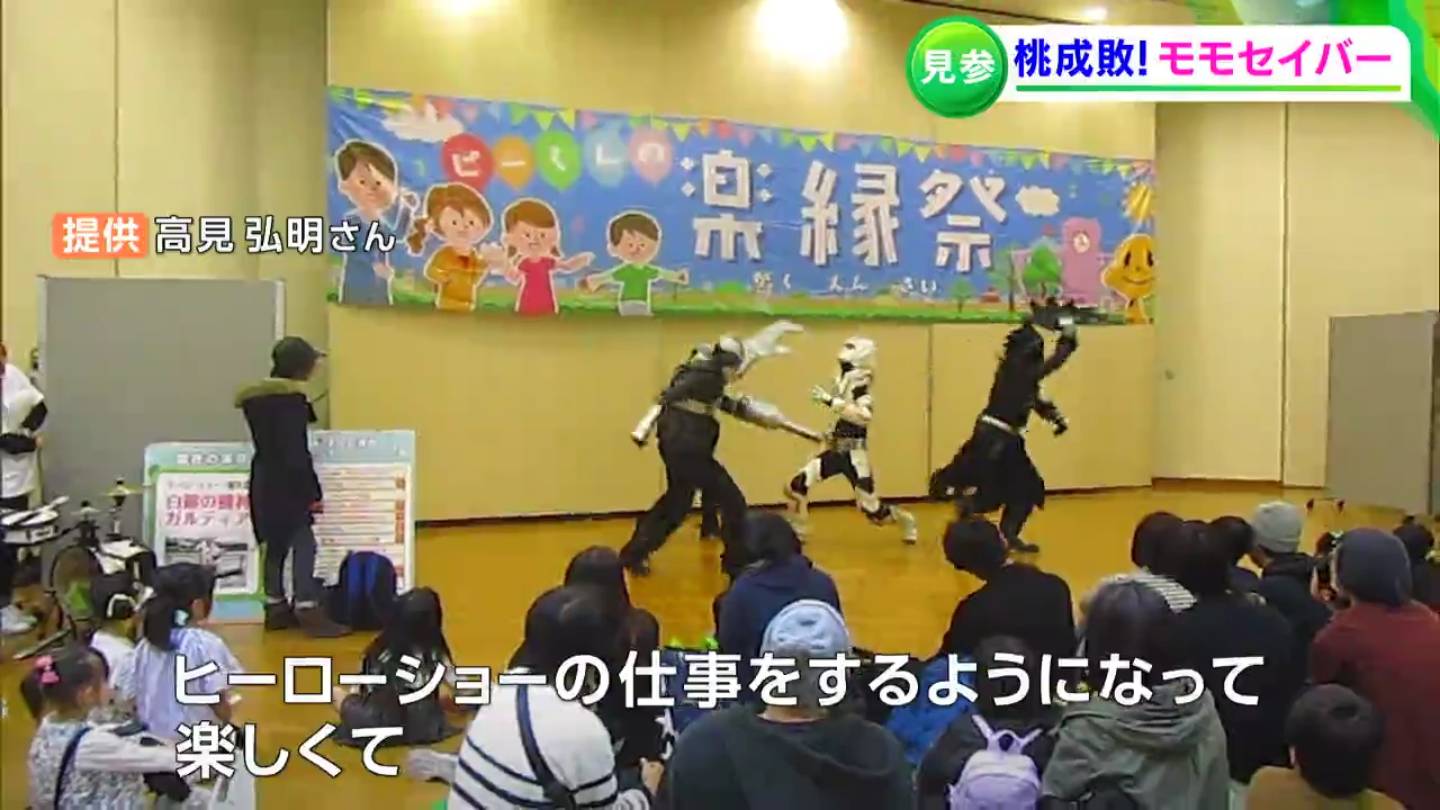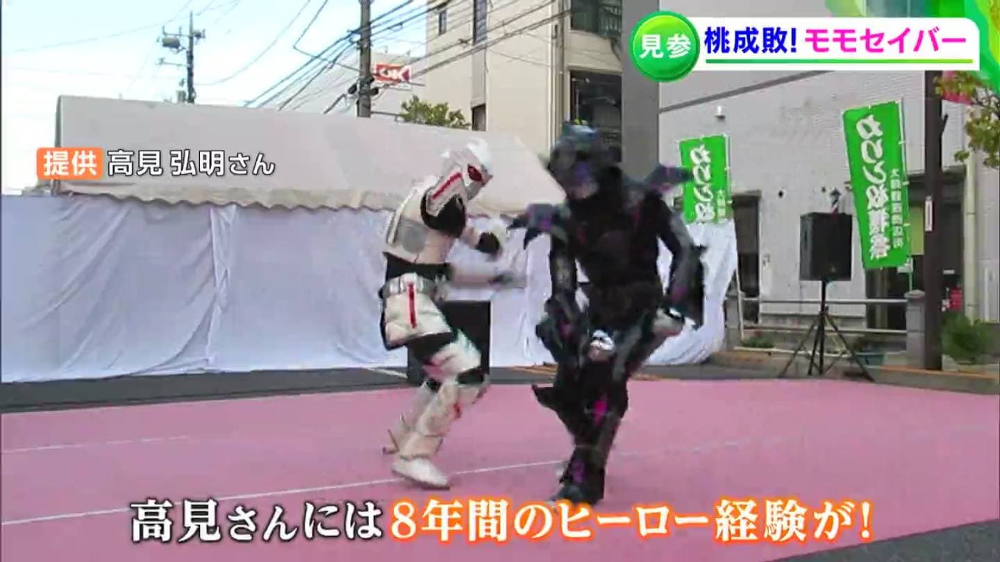 スーツの中には正義の心とふるさとへの熱い思い。きょうもどこかで・・・モモセイバー!
