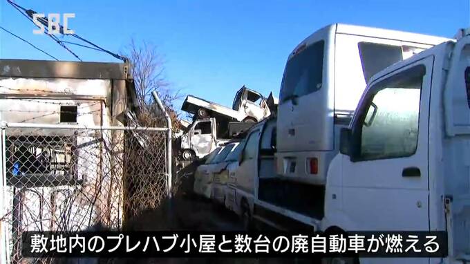 火は1時間あまりで消し止められましたが、敷地内のプレハブ小屋と数台の廃自動車が燃えました。