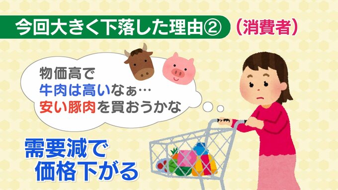 さらに、物価高も影響します。ものが高いとき節約意識が高まり、高級な和牛を買うのは控えようという動きになります。そのため、需要が減り、価格も下がることにつながります。