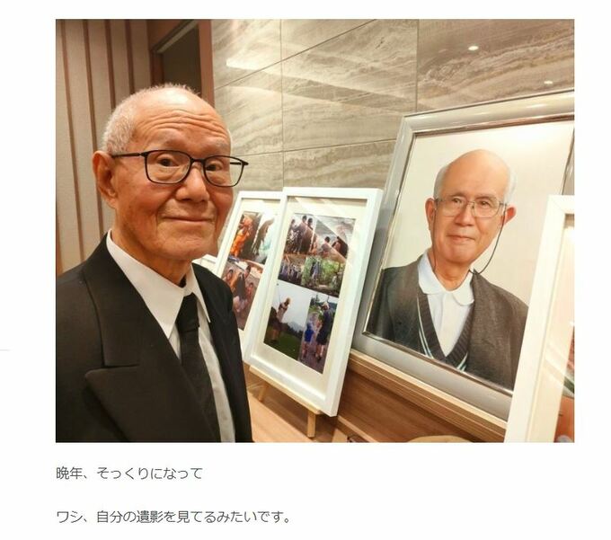 続けて、ちばさんは「生前は、七三太朗(なみたろう)のペンネームでマンガの原作者として、また、ちばあきおやワシのストーリーのアドバイザーとしても頑張ってくれました。」と感謝を述べ、さらに「晩年、そっくりになって ワシ、自分の遺影を見てるみたいです。」と、七三太朗さんの遺影と一緒に写した写真をアップし、偲びました。
