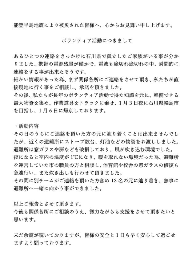 そして「まず関係各所にご連絡をさせて頂き、私たちが直接現地に行く事をご相談し、承諾を頂きました。」と、然るべき手続きをとったと明示。「私たちが長年のボランティア活動で得た知識を元に、準備できる最大物資を集め、作業道具をトラックに乗せ、1月3日夜に石川県輪島市を目指し、1月6日に帰京しております。」と、すでに活動を一旦終え、戻ってきていることを明かしています。