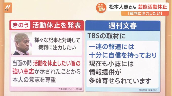 松本人志さんが吉本興業のホームページで活動休止を発表しました。松本さんは「様々な記事と対峙して裁判に注力したい」。吉本興業側は、「当面の間、活動を休止したい旨の強い意志が示されたことから、本人の意志を尊重する」と掲載しています。