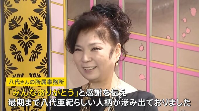 復帰を目指し、治療とリハビリに励んでいたという八代さん。容態が急変し、12月30日に亡くなりました。葬儀は事務所のスタッフのみで8日に執り行われたということです。
