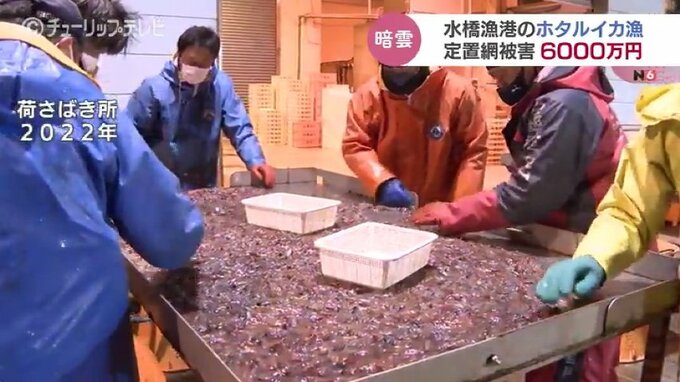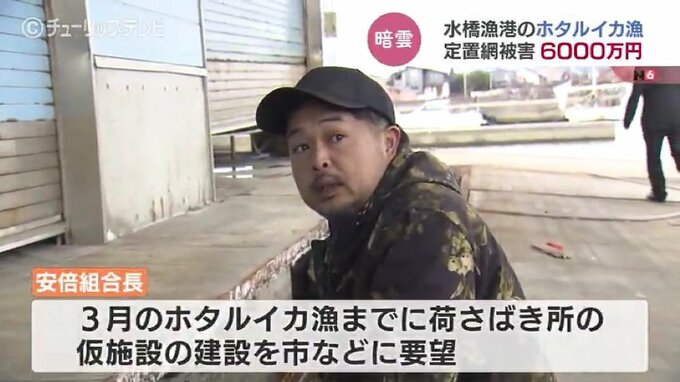 荷さばき所ではホタルイカの荷揚げから選別、入札まで行いますが、地盤沈下で使用できなくなりました。ホタルイカは鮮度が落ちやすく、ほかの港に持ち込むことができないため、安倍組合長は3月の漁開始までに荷さばき所の仮施設の建設を市などに要望する考えです。
