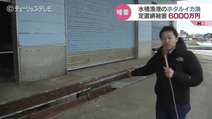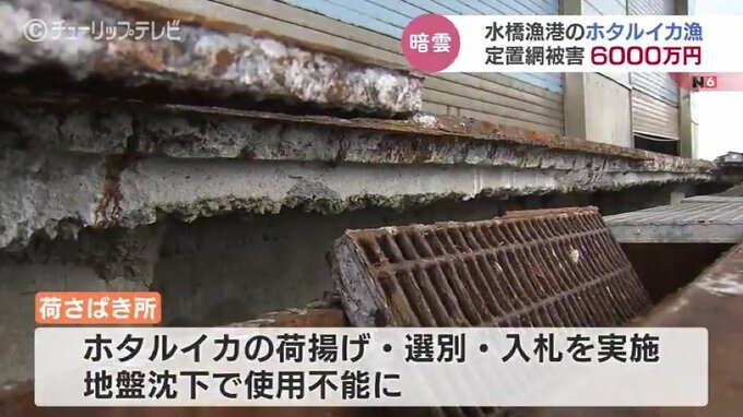 毛田千代丸キャスター:「水橋漁港の荷さばき所です。地震の影響で地面が30センチほど下に下がり、大きな隙間ができています。これにより、ホタルイカの荷揚げもできない状況です」