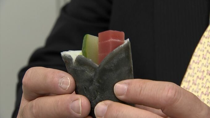 (古川豪太記者)「東北東を向いて一口かじってみると…甘いこのマグロ、イチゴ味です。これ実は和菓子なんです。」