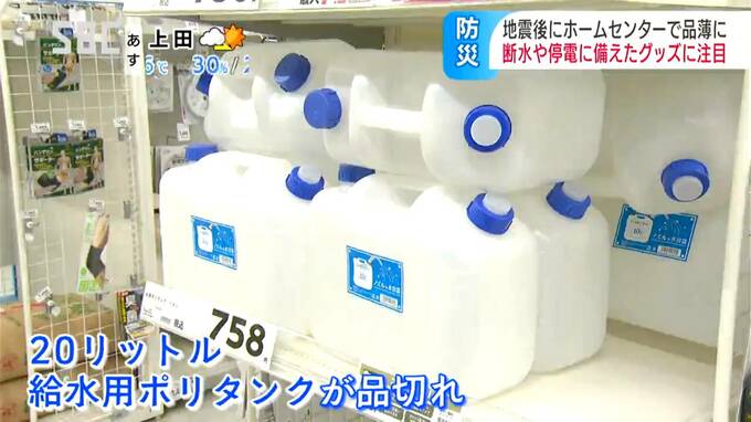 今回の地震では飯山市内など、県内の一部でも断水が発生したほか、被災地では今も深刻な水不足が伝えられていることから、家庭でもポリタンクを備える動きがあるということです。