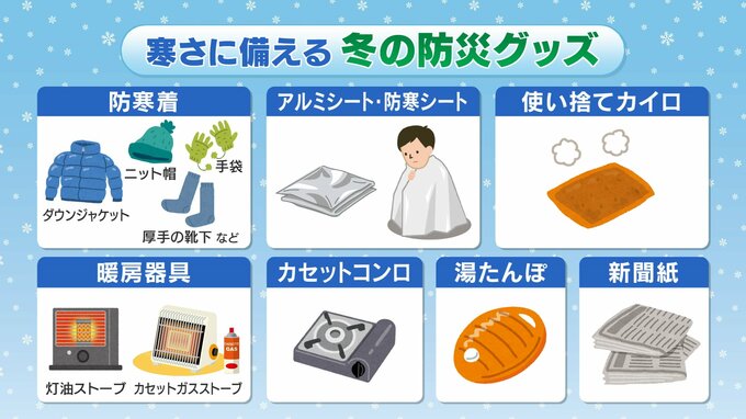当時のTUFスタッフに、あってよかったと感じた備えを聞いてみると、まずは当然「防寒着」です。かさばらないようになるべく着てから避難してください。