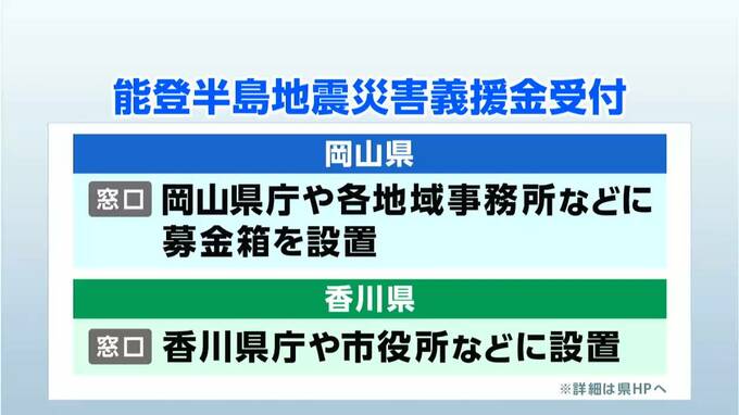 岡山県では、きょう(10日)から義援金の受付を開始しました。岡山県庁や県民局などに募金箱を設置しています。また香川県でも県庁や図書館などに募金箱が設置されています。詳しい情報はHPをご覧ください。