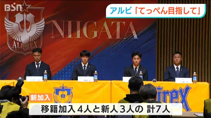 サッカーアルビレックス新潟の今シーズンの新体制が10日、発表され小野裕二 選手ら新加入の7人が意気込みを語りました。