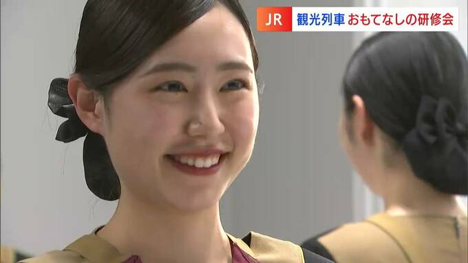 JR四国が運行している「四国まんなか千年ものがたり」などの観光列車の接客サービスの質を高めようと研修会が行われました。「スマイルトレイニングです。『い』。目が笑ってますか?口も笑ってる」JR四国の観光列…