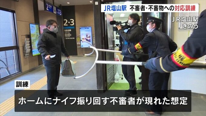 駅員が、さす股を持って「ナイフを置いてください」などと不審者をけん制し、通報で駆け付けた警察官が取り押さえました。