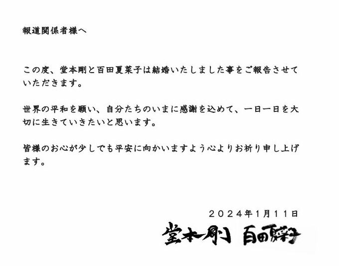 この度、堂本剛と百田夏菜子は結婚いたしました事をご報告させていただきます。