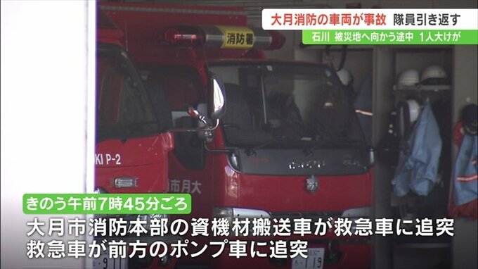 大月市消防本部によりますと10日午前7時45分ごろ、能登半島地震の被災地に緊急消防援助隊として出動していた資機材搬送車が救急車に追突し、その勢いで救急車が前方のポンプ車に追突しました。