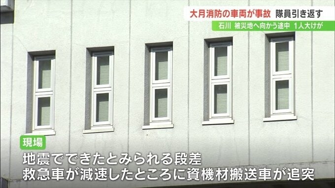 現場の道路は地震でできたとみられる段差があり、救急車が減速したところに資機材搬送車が追突したということです。