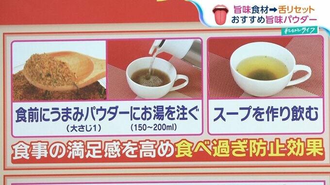 この「うまみパウダー」(大さじ1)にお湯(150~200ml)を注いでスープを作り、食前に飲むことで、食事の満腹感を高め、食べ過ぎ防止の効果があるそうです。