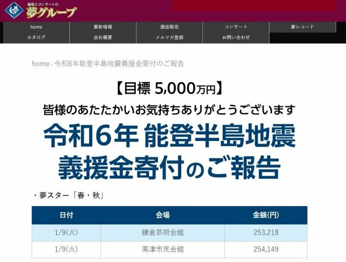 夢グループは5日に、9日に神奈川県・10日に奈良県で予定されている公演を含め、それ以降兵庫県・大阪府・愛知県で行なわれる公演全ての会場で義援金を募って石川県庁に寄付すると告知していました。