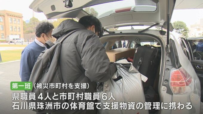 第一班は県職員4人と市町村職員6人で、支援物資の拠点となっている石川県珠洲市の体育館で物資の搬入や搬出などに携わることになっています。