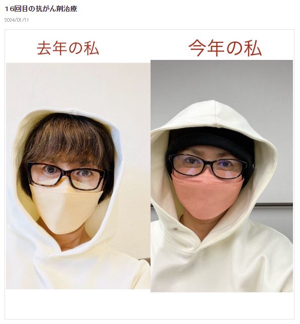 古村さんは「16回目の抗がん剤治療」と題して投稿。「今日2024/1/11は『またがんが再発してしまいました』と伝えられてから(2023/1/11) 丁度一年が経ったので 二年目ということかしら」と振り返りました。