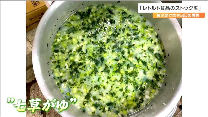 材料は、現地の農家などから提供された大根の葉やキャベツなど。三木さんオリジナルの温かな七草がゆは避難所で喜ばれました。