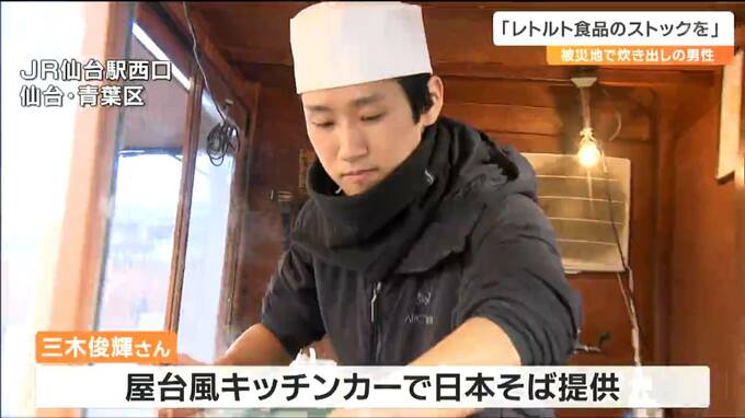 三木俊輝さんは、屋台風のキッチンカーを使って仙台駅前で日本そばを販売しています。三木さんは1日に発生した能登地震で被害を受けた石川県七尾市などで、4日から4日間、ボランティアで炊き出しをしてきました。作ったのは、日本そばではなく野菜を入れた粥。三木さんは以前、京都で和食の料理人をしていて、今回はその経験が活きたと話します。