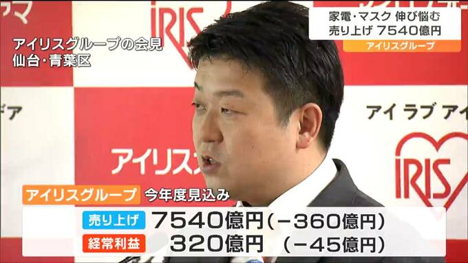 会見によりますと、アイリスグループの今年度の売り上げは、昨年度を360億円下回る7540億円、経常利益は45億円下回る320億円となる見込みです。減収減益は2年連続で原料価格の高騰や、コロナ禍が落ち着き、家電やマスクの売り上げが伸び悩んだのが要因だということです。一方、食品は売り上げが伸びていることから来年度は、8800億円の売り上げを目指します。