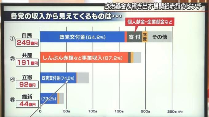 政党交付金を受け取らず、企業団体献金も受け取らない日本共産党だが、実は野党第一党の立憲民主党よりも収入は多い。自民党はダントツの249億円の収入。立憲民主党は92億円。これに対し日本共産党の収入は191億円。その内訳は…。