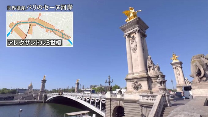 まずは今年の舞台となるパリ。中心部を流れるセーヌ川沿いの約5キロの地帯が、「パリのセーヌ河岸」という世界遺産になっています。番組「世界遺産」ではナレーターの杏さんが現地取材をする「杏の世界遺産散歩 in パリ」という連続ミニコーナーを放送中で、主にこの「パリのセーヌ河岸」に含まれている世界遺産を取り上げています。たとえば4年前の火災から復旧工事中のノートルダム大聖堂、礼拝堂のステンドグラスが見事なサント・シャペル、「パリで一番美しい橋」といわれるアレクサンドル3世橋などなど。