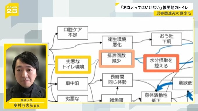 「トイレの環境が悪くなると、どうしても(トイレに)行きたくなくなりますよね。できるだけトイレに行く回数を減らして我慢しようとなる。便を出す回数が減るから便秘気味になる、水分摂取を控える方も出てくる。脱水症状になると口腔内の細菌が増えたり、誤えん性肺炎やエコノミークラス症候群に発展していきかねない。(災害)関連死を出さないようにすべきことは高度な医療行為ではない。トイレや雑魚寝、食事などの問題」