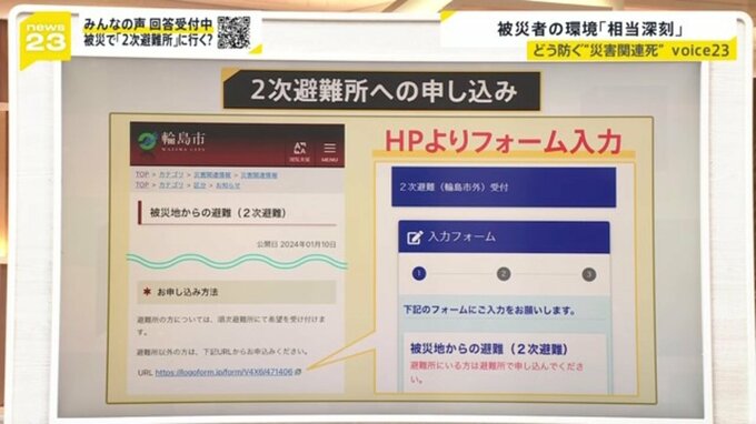 輪島市の場合ですと、避難所はホームページから申し込むことができるそうです。2次避難所までの移動手段などを入力することで、実現できるということです。