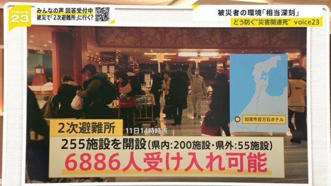 より良い環境という点で言いますと、2次避難所があります。石川県では、11日14時時点で、255の施設を県の内外に開設しています。(県内:200施設・県外55施設)6886人の受け入れが可能で、日ごとに数は増えてきている段階に差し掛かっているそうです。