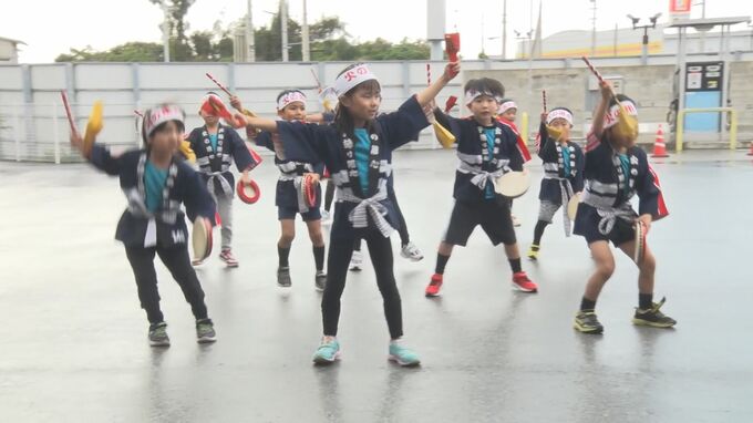 渡具知市長による特別点検が行われたあと、市内3つの保育園でつくる「名護市幼年消防クラブ」の園児らが、元気よくダンスやエイサーを披露しました。