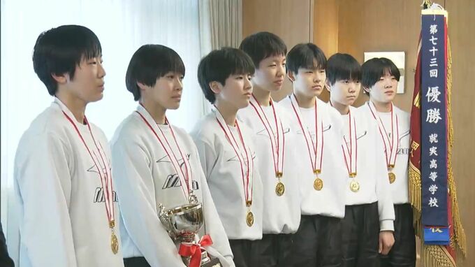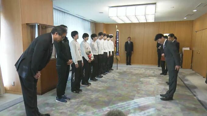 全日本バレーボール高校選手権で、2大会ぶり5度目の優勝を果たした就実高校バレーボール部が岡山県庁を訪れ、知事に優勝を報告しました。