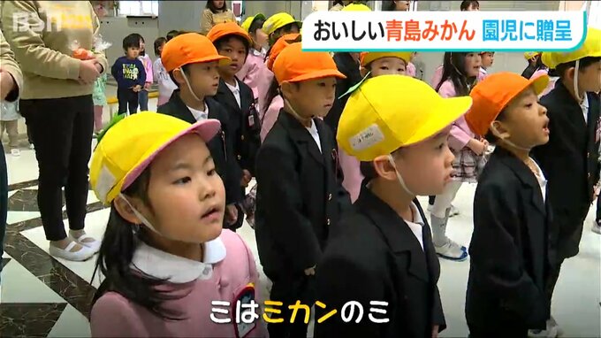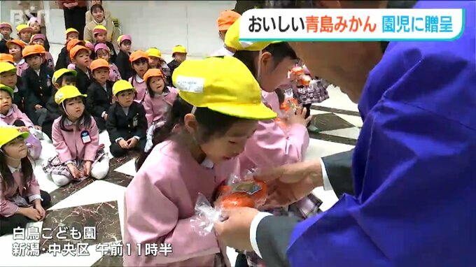 新潟市の幼稚園児に静岡県特産の青島みかんが今年もプレゼントされました。