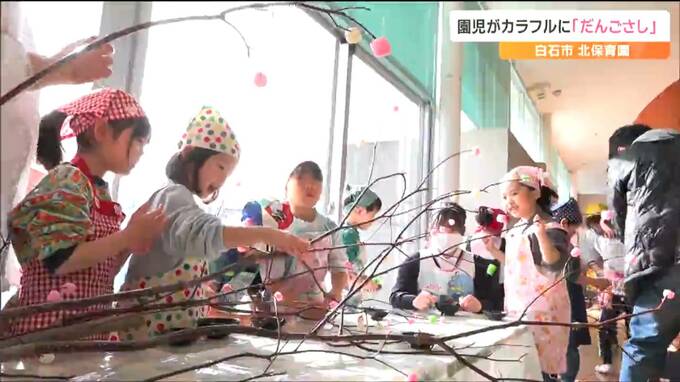 北保育園では子どもに小正月の伝統行事を理解してもらい、一年の健康を祈願するために毎年「だんごさし」をしています。だんごが刺さったミズキの木は1週間ほど園内に飾られる予定です。