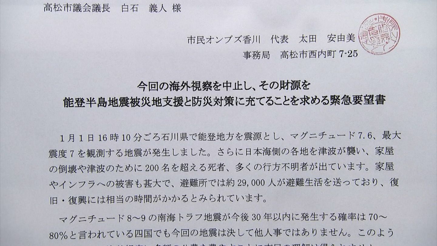 市民オンブズ香川は、高松市議会が今月(1月)予定をしている海外視察を中止して、その財源を能登半島地震の被災地支援に充てることを求める要望書を提出しました。