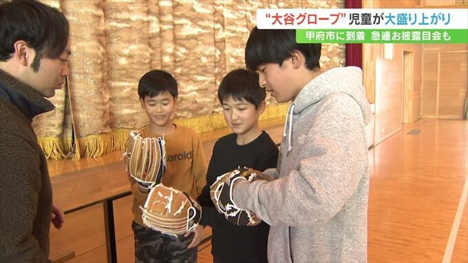 メジャーリーガーの大谷翔平選手が全国の小学校に贈っている「グローブ」がきょう12日、甲府市にも届きお披露目会が行われました。